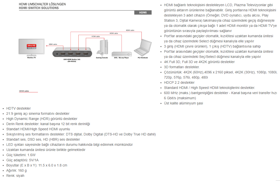 Digitus 4K 2'li HDMI Video Çoklayıcı DS-46304