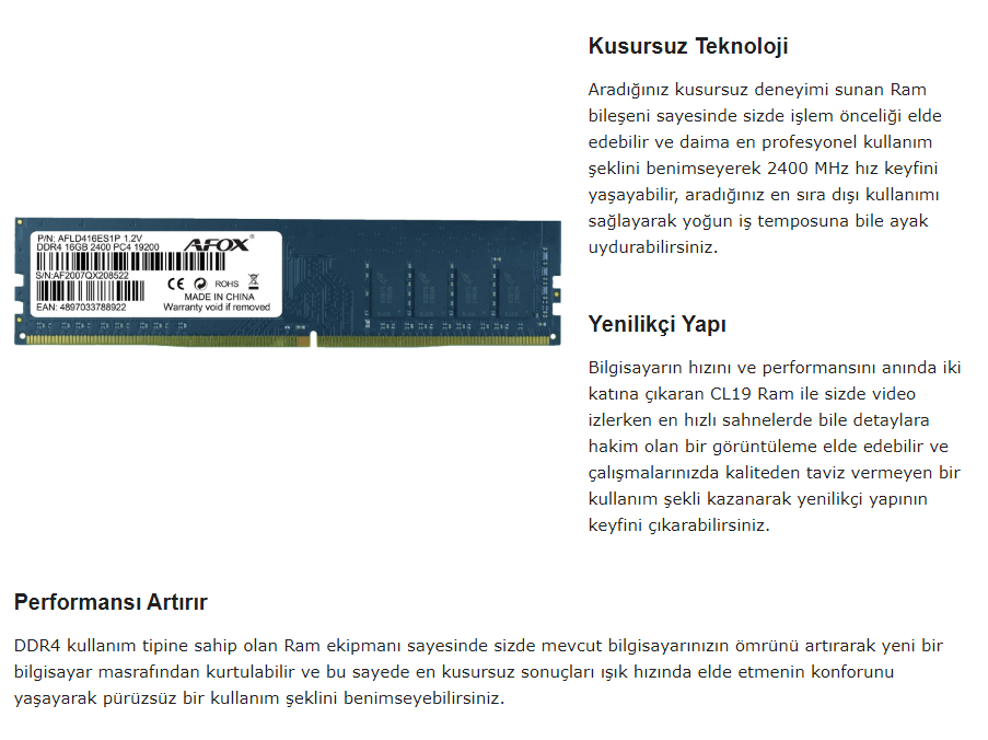 Afox DDR4 16GB 3600MHZ Masaüstü Ram Bellek AFLD416RS1C