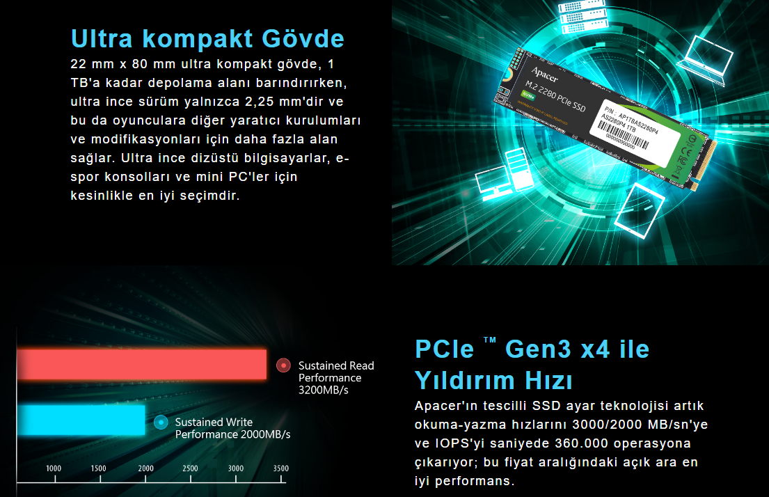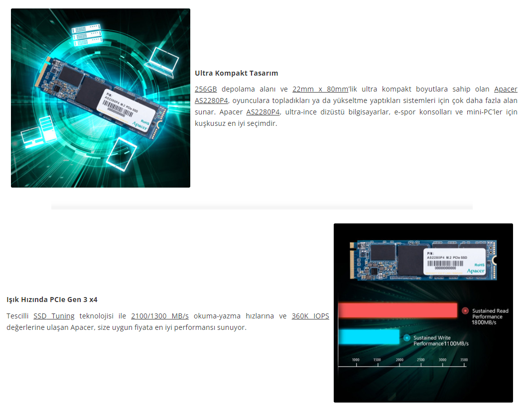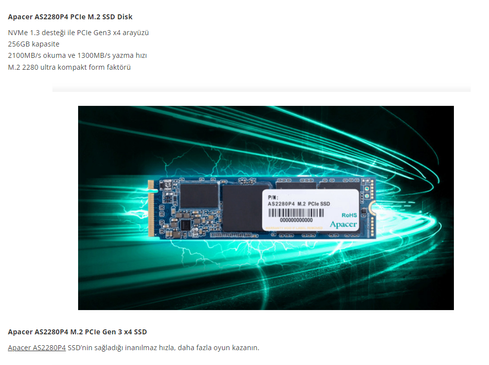 Apacer AS2280P4 256GB 2100/1300MB/s NVMe PCIe Gen3x4 M.2 SSD Disk AP256GAS2280P4-1