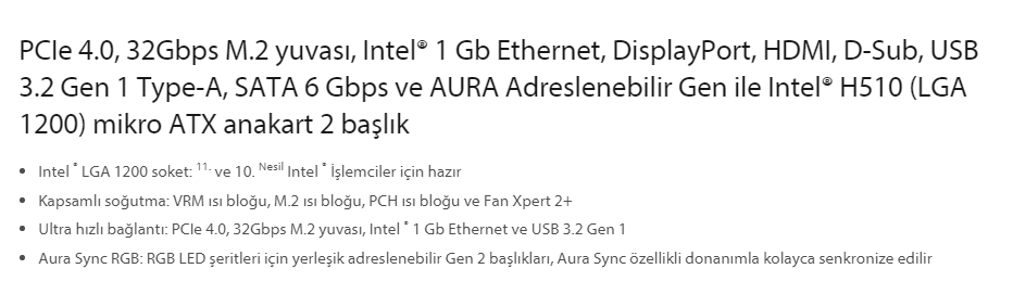 1 x Intel® I219-V 1Gb Ethernet bağlantı noktası