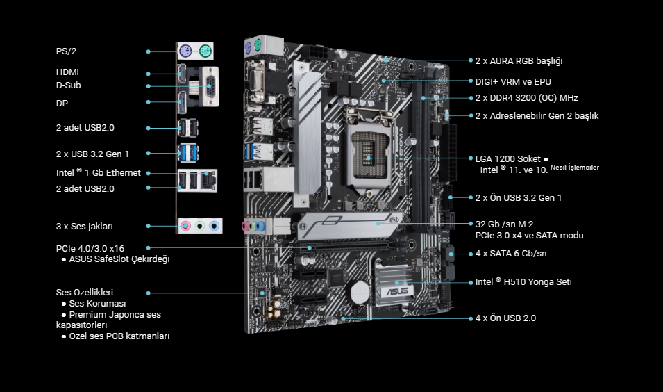 ** Intel® 11. ve 10. Nesil işlemciler, maks. 4096 x 2304 @60Hz çözünürlük. Herhangi bir güncelleme için lütfen www.intel.com adresine bakın.