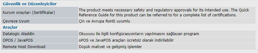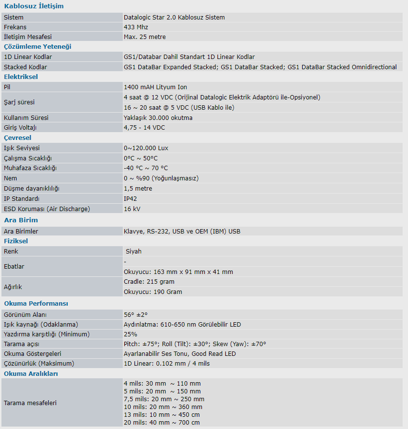 ● 1D barkodları okuyabilme ● Datalogic Star Sistem ile Kablosuz veri aktarma (Max. 25 metre) ● Kapsama alanı dışında hafızaya alabilme özelliği ● Çoklu arabirim seçenekleri ● IP42 Standartlarında ● 1,5 metreden düşmeye dayanıklı ● Stand üzerinde dahi okuyabilme
