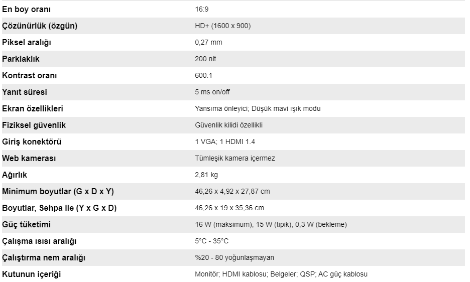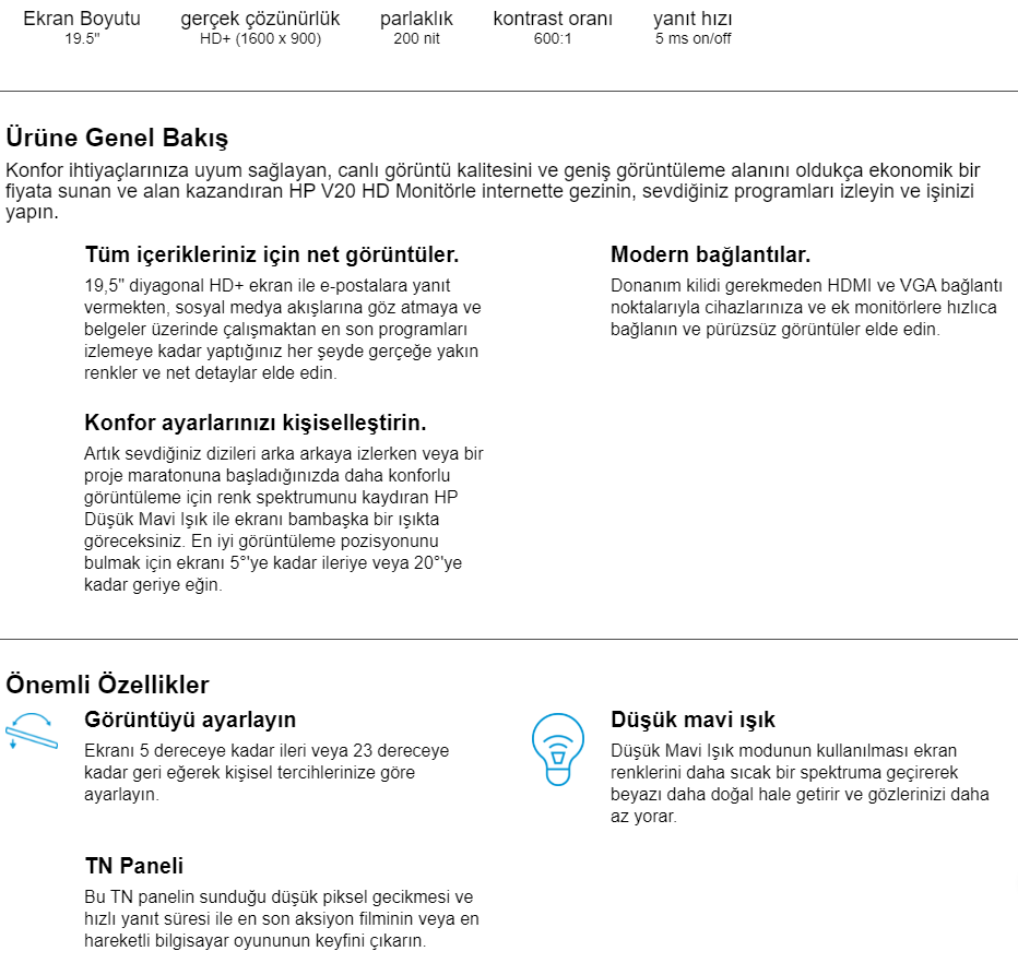 HP 19.5" V20 5ms HD Vga Hdmi TN LED Monitör 1H850AA