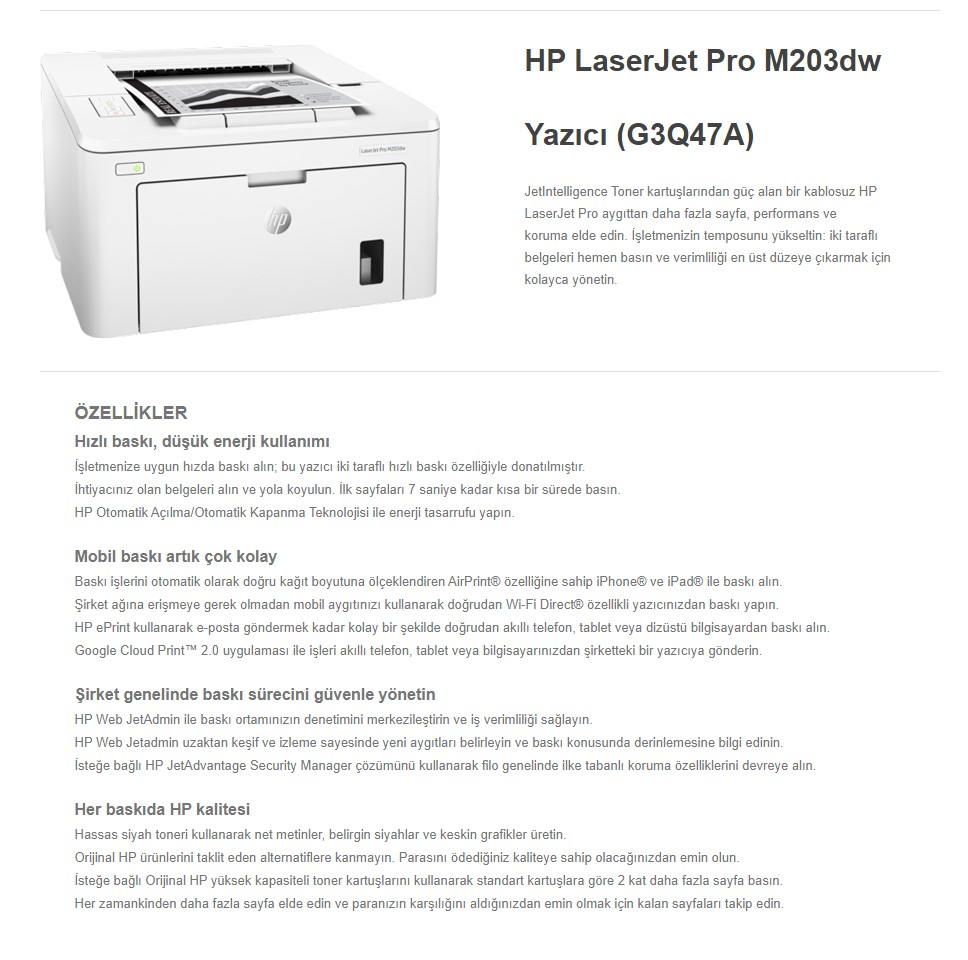HP LaserJet Pro M203DW Mono Laser WiFi 28ppm A4 Yazıcı G3Q47A