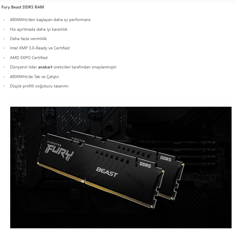 Kingston Fury Beast 16GB DDR5 5600MHz CL36 Siyah Gaming Ram (Bellek) KF556C36BBE/16