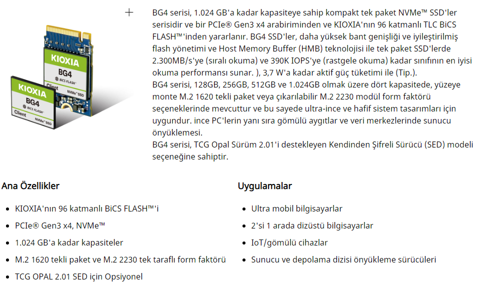 Kioxia SSD 512GB BG4 M.2 2230 PCI KBG40ZNS512G