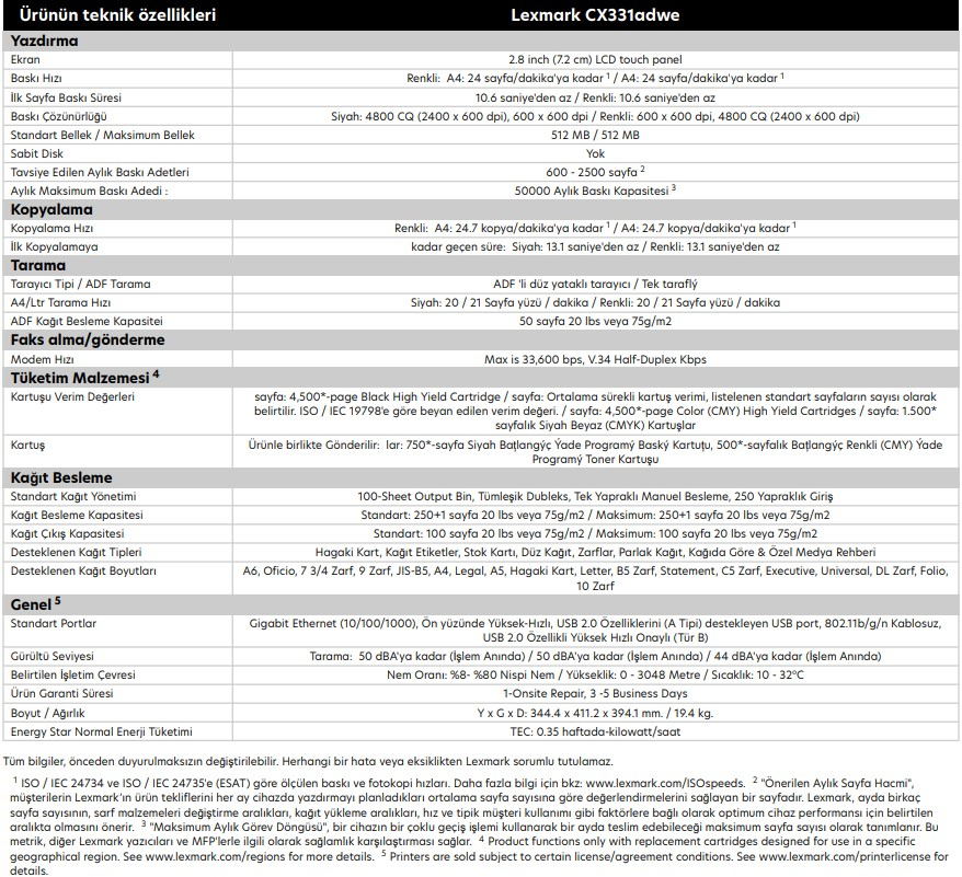 | Yazıcı Tipi | Çok Fonksiyonlu |