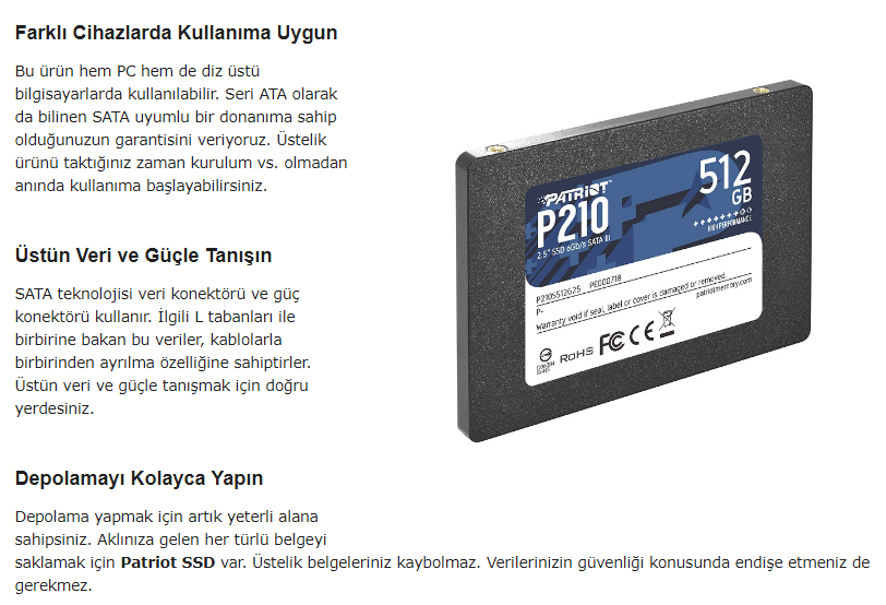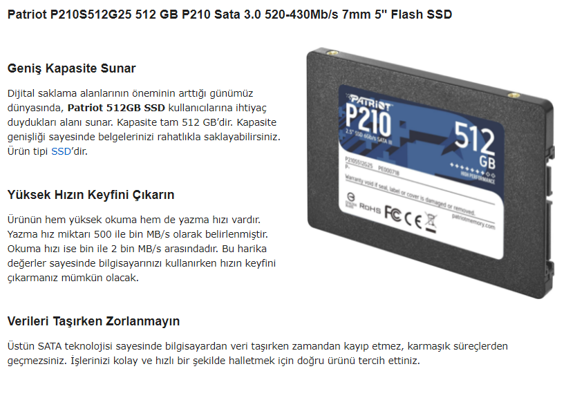 Patriot 512GB P210 Sata 3.0 520-430MB/s 7mm 2.5" Flash SSD P210S512G25