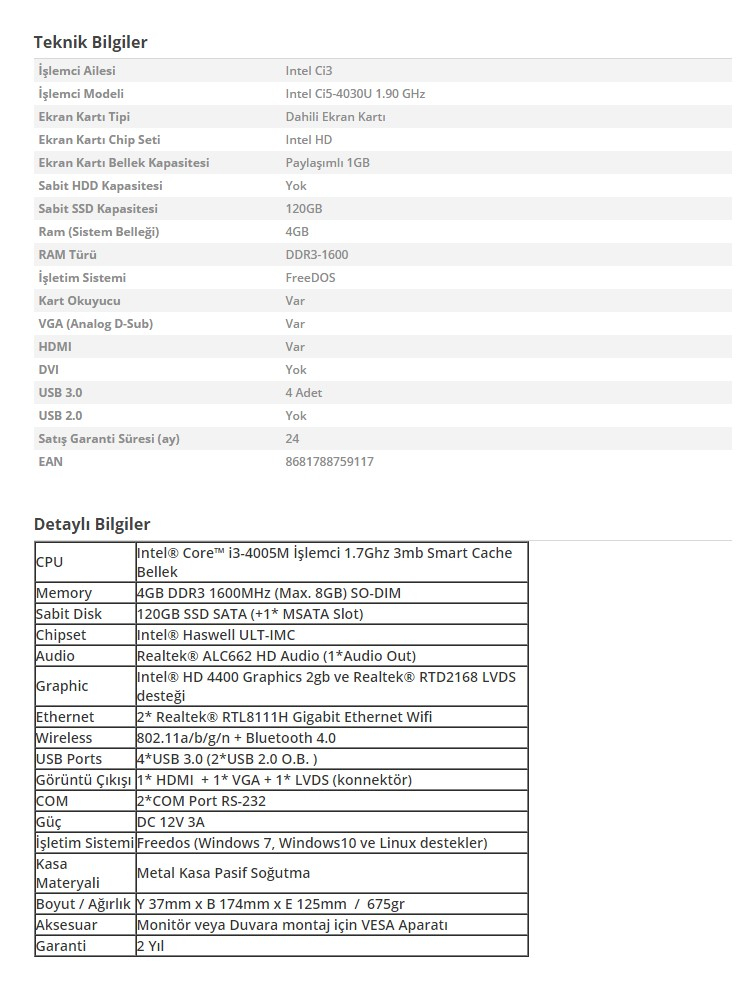 | İşlemci Modeli | Core i5 - 4030U |