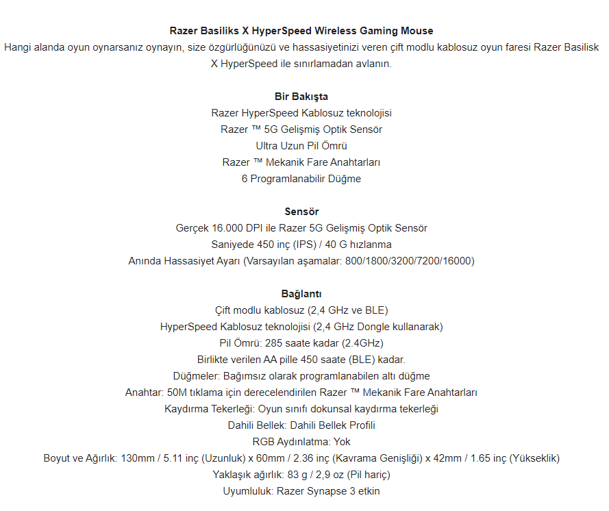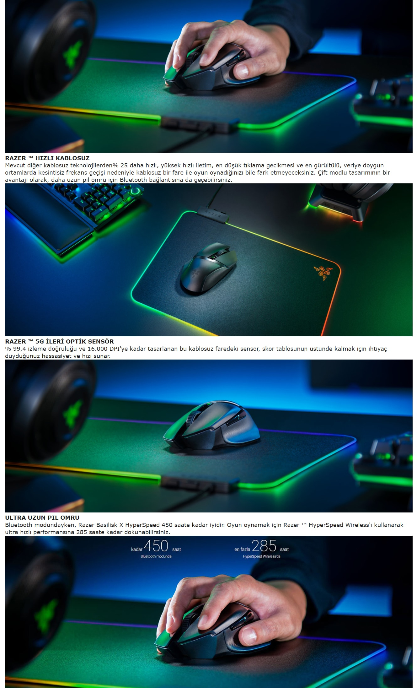 Razer Basilisk X Hyperseed Kablosuz Optik Gaming Mouse RZ01-03150100-R3G1