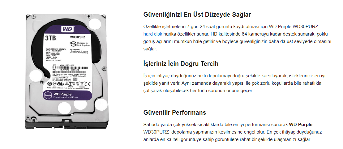 Western Digital 3TB Purple Sata 3.0 5400RPM 64MB 3.5" Dahili Güvenlik Diski WD30PURZ